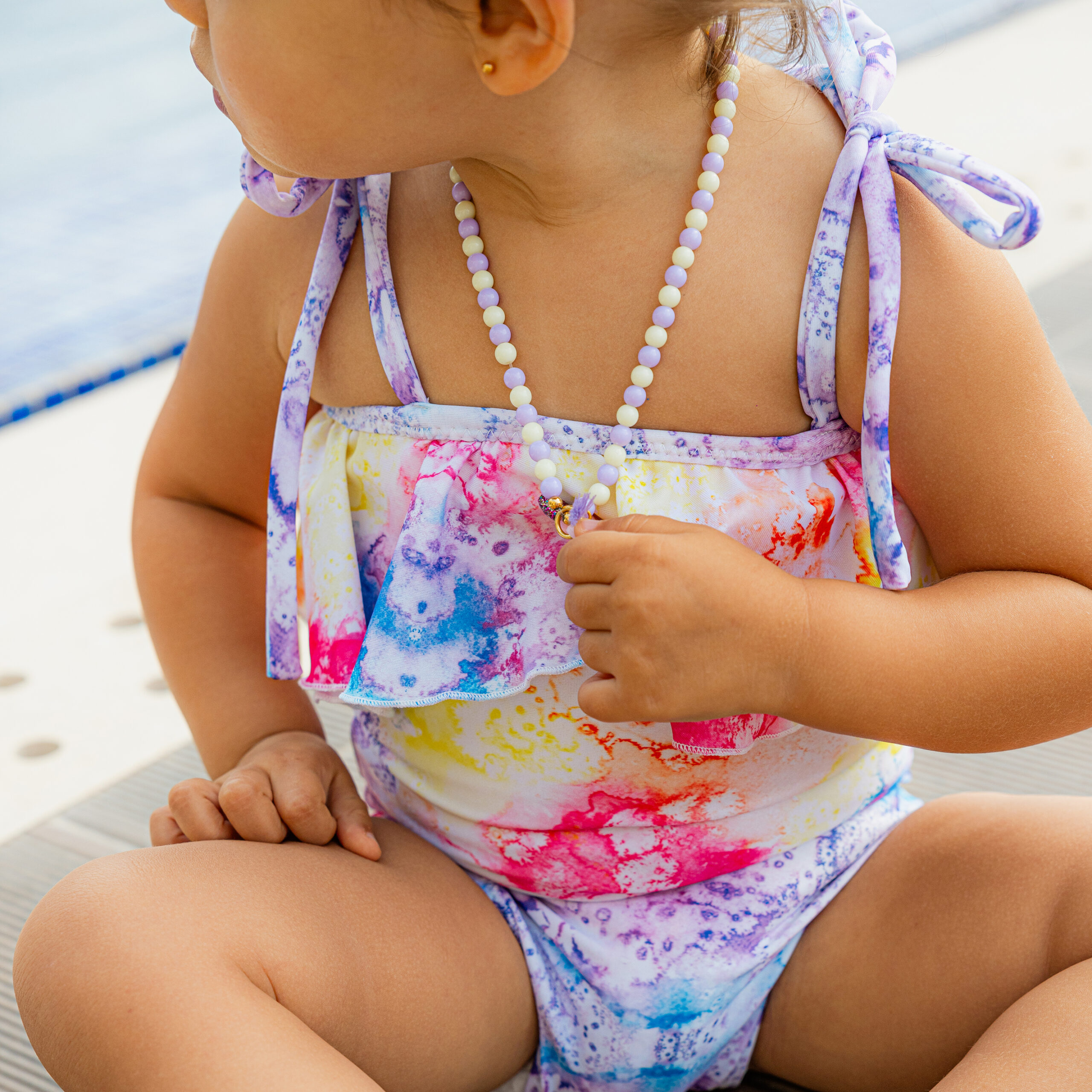 Um mergulho de ternura e liberdade. Este fato de banho de bebé combina conforto ajustável com detalhes encantadores: alças com atilhos que se regulam delicadamente, um folho generoso que abraça o decote e um padrão exclusivo Mary Tale em aguarela, inspirado nas cores suaves da maré.
