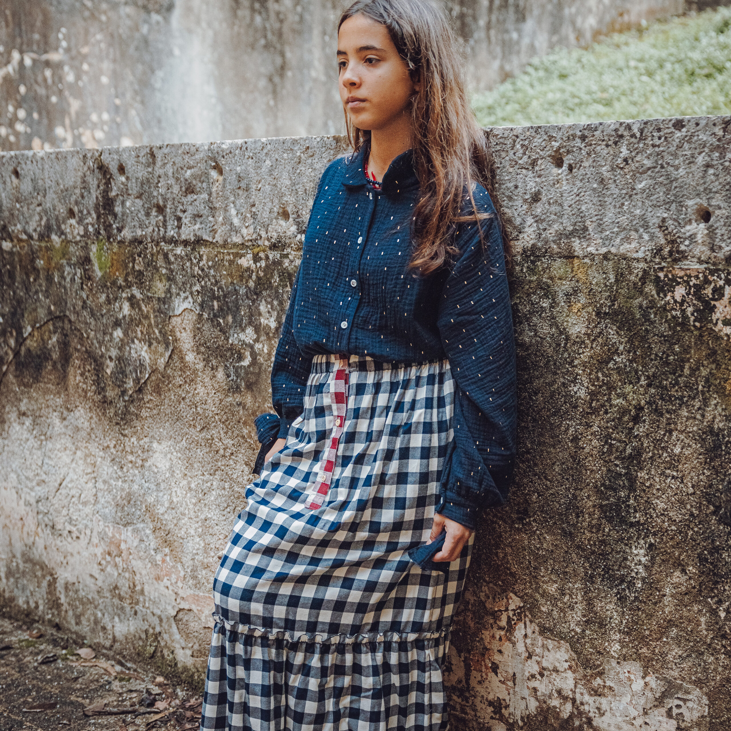 Saia comprida em padrão de quadrados clássicos, com um cair suave e confortável, ideal para dias descontraídos ou momentos especiais. O desenho inclui uma abertura frontal com botões em detalhe contrastante, que acrescenta charme e personalidade à peça. A parte inferior termina com um volante franzido, trazendo movimento e leveza ao look.