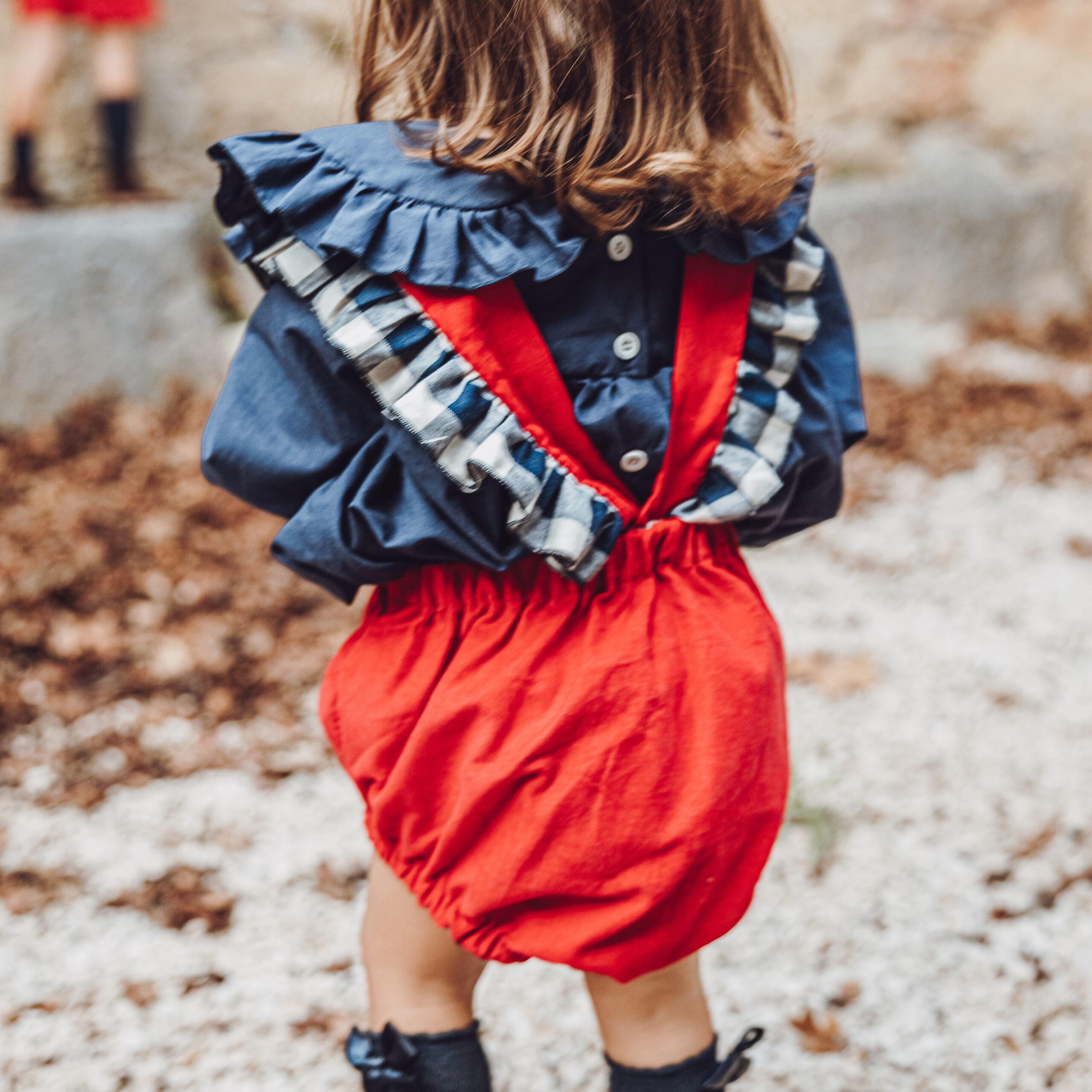Folho em xadrez azul nas alças, que acrescenta um toque clássico e delicado.