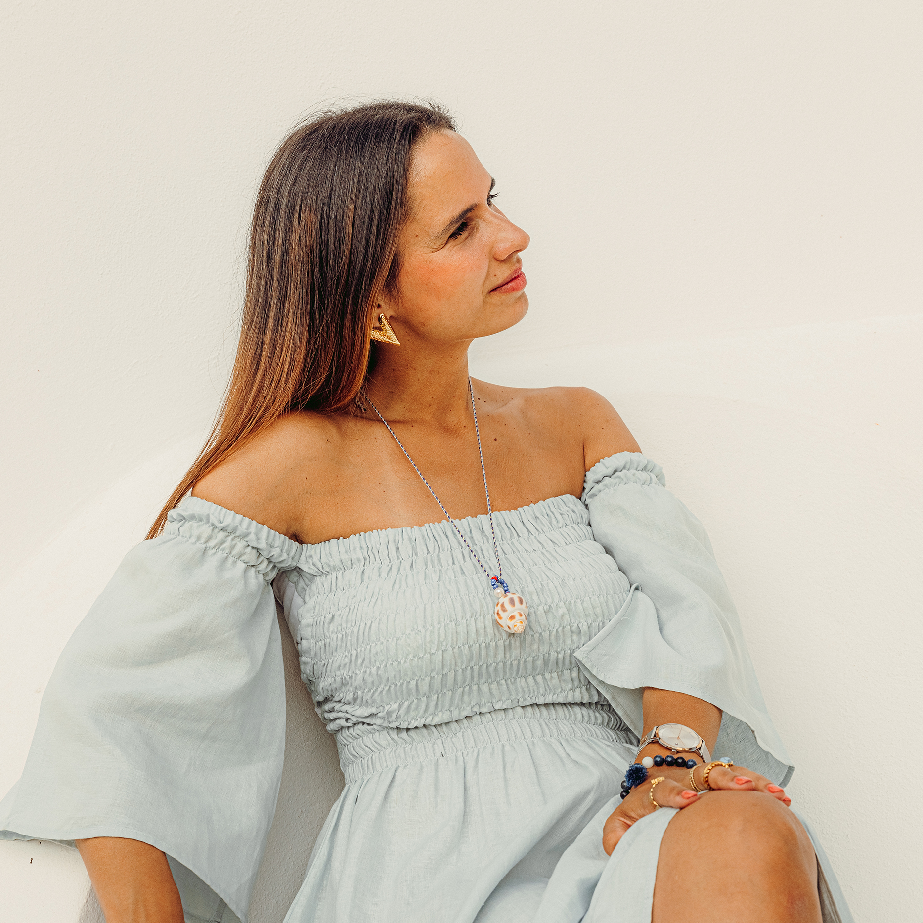 Inspirado na suavidade das marés e nos dias de sol sem pressa, este vestido comprido em linho é um convite à leveza e ao movimento. O corte elegante combina com a simplicidade dos detalhes: costas abertas com fitas reguláveis que se cruzam e ajustam delicadamente, com um estampado subtil de peixinhos — um pequeno segredo do mar que acompanha quem o veste.